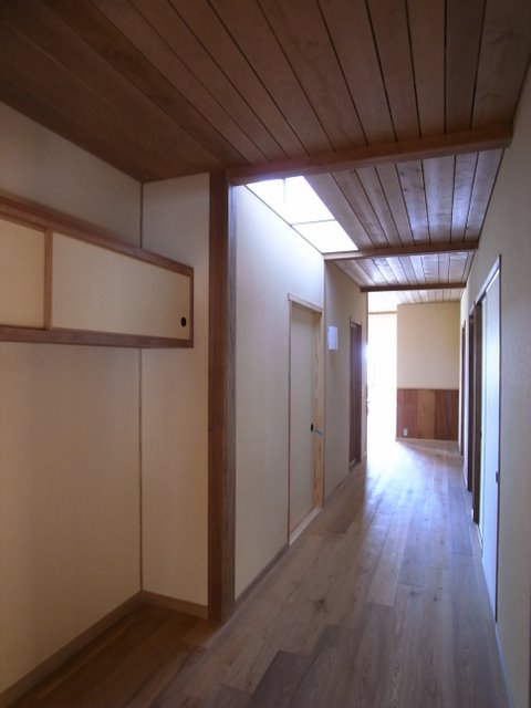 上山市 T邸-24 2009年2月1日 最終更新日時 : 2009年2月1日 玄関を左手に、廊下から居間を見てます。 アイランドキッチンの流し台から見た居間です。 囲まれた廊下に、サイドライトの光が明るく感じます。正面片引襖の先が和室です。 8帖の和室。腰付雪見障子部分が縁で、右の襖奥は仏間です。