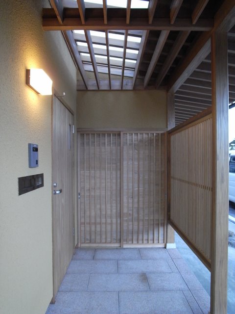 玄関ポーチの錆御影石が貼られ、掃除具入の引違竪舞良戸が取付きました。