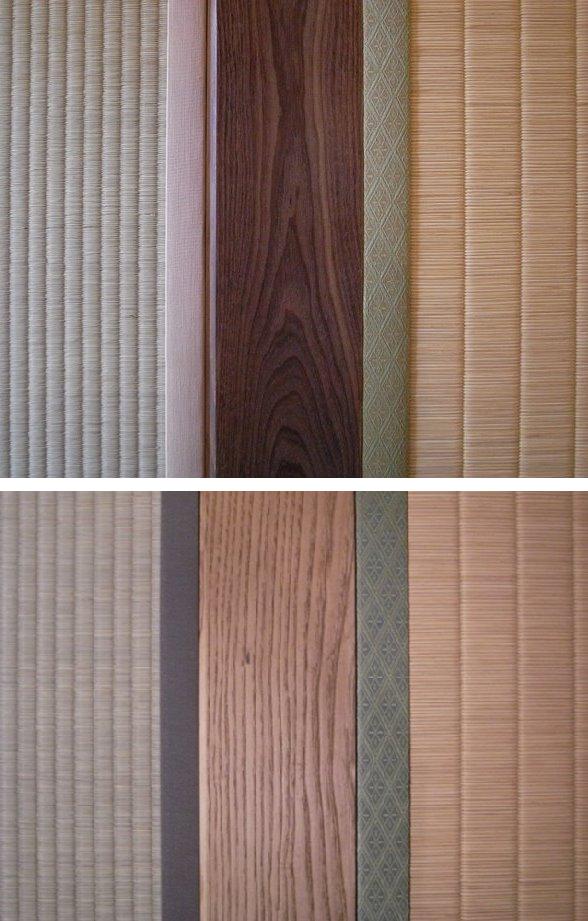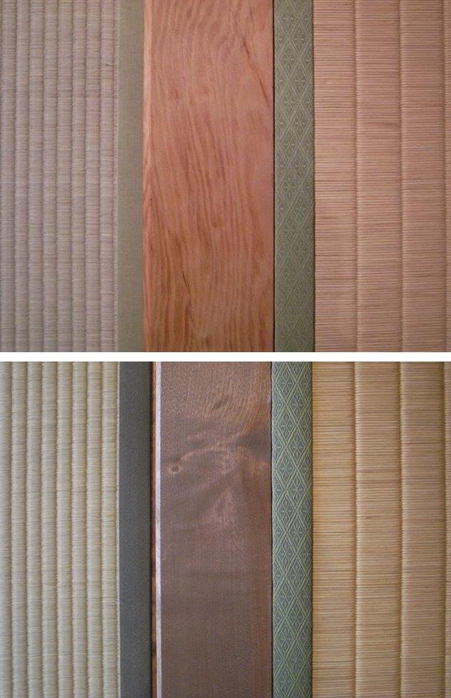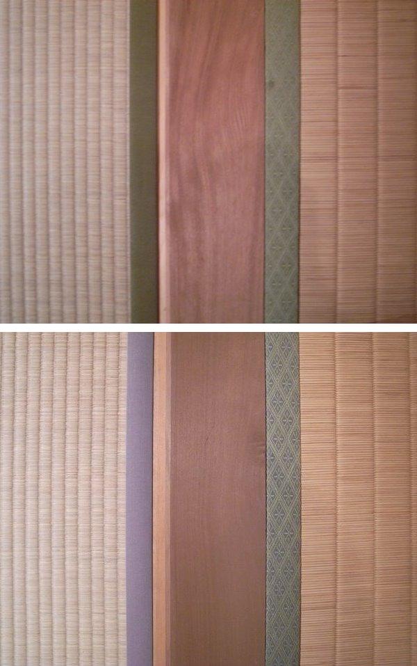 赤湯温泉 松島館-その14 2008年8月20日 最終更新日時 : 2008年8月20日 客室の畳縁は各室違えました。 20年来愛用している、福井の石田織布製ヘリです。 右側が床の間でリュービン赤の床畳です。 床框は (上)槐(エンジュ):延寿などと書いて喜ばれる材です。 (下)栗:男性的な荒い木目です。 (上)脂松(ヤニマツまたはコエマツ):赤松や黒松の特に脂気の多い部分 (下)桜 (上)板屋楓 (下)朴:おとなしい木目です。
