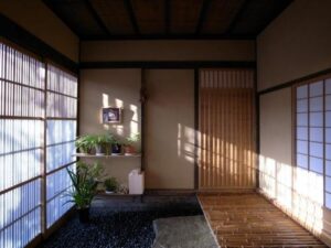 旅館のロビーから、渡り廊下でオーナーの住宅に行けます。 昔の蔵戸や古い家具がオーナーのセンスで置かれています。 渡り廊下より、一部中庭の外部空間があります。